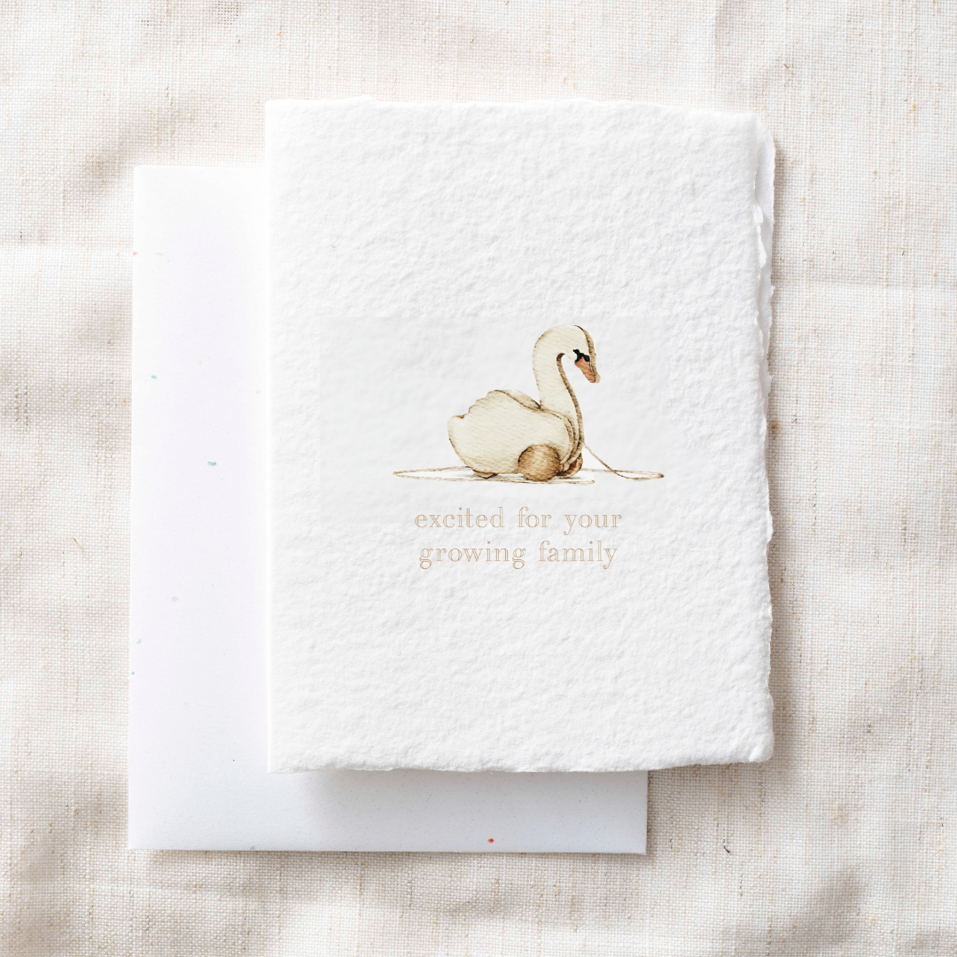 A gentle way to celebrate a new chapter. Featuring a soft watercolor swan and baby, this heartfelt card includes the message “excited for your growing family” in warm taupe letterpress. Printed on textured, deckled-edge handmade paper and paired with a speckled recycled envelope, it’s a beautiful choice for baby showers, pregnancy reveals, or adoption celebrations. Perfect for baby boutiques, maternity gift boxes, and shops that value craftsmanship with a cause.