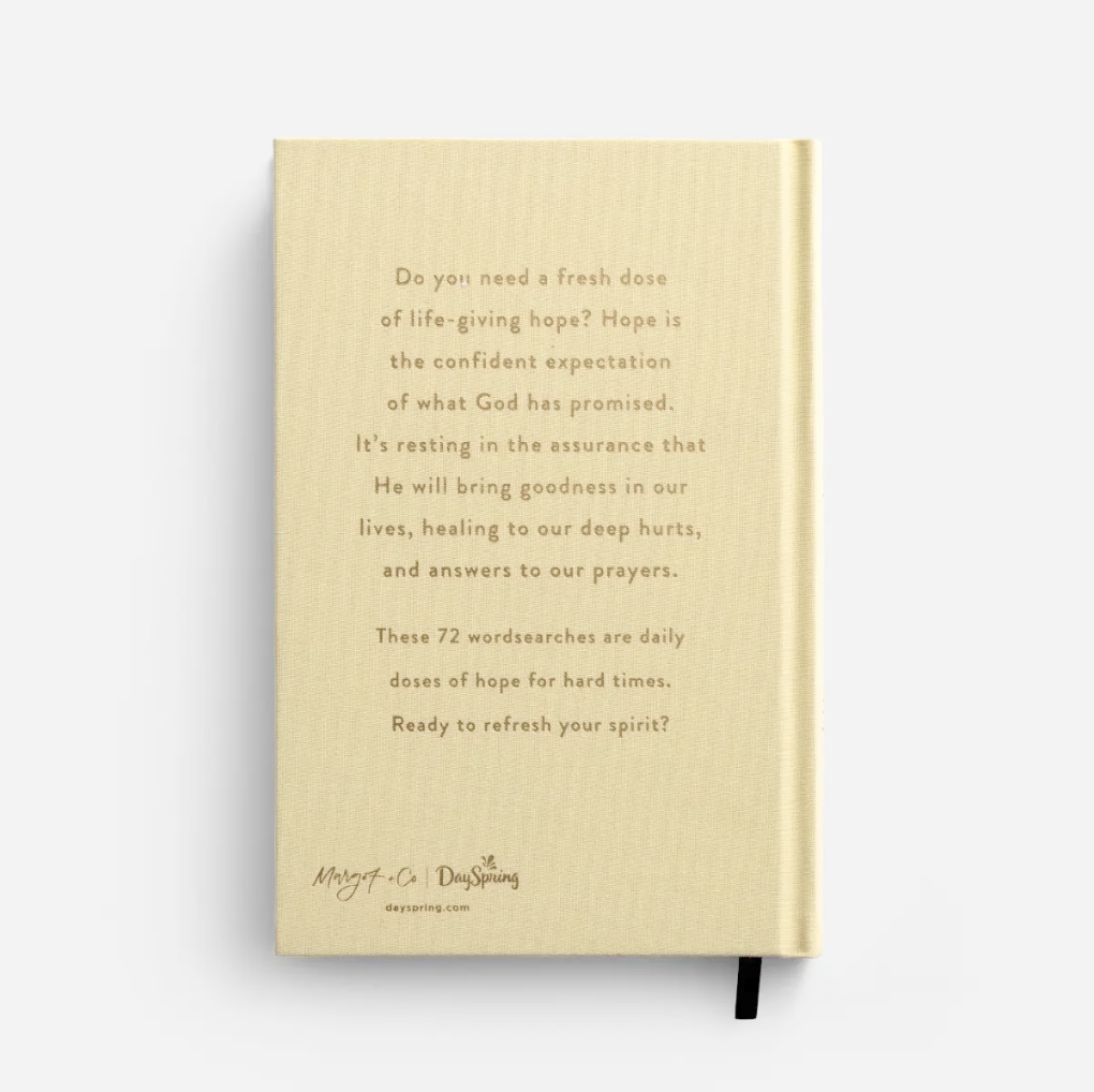 Features: Linen bound, 6x9 hardcover, 72 wordsearches made up of quotes and scripture on Hope, check-in pages, and a bookmark ribbon.