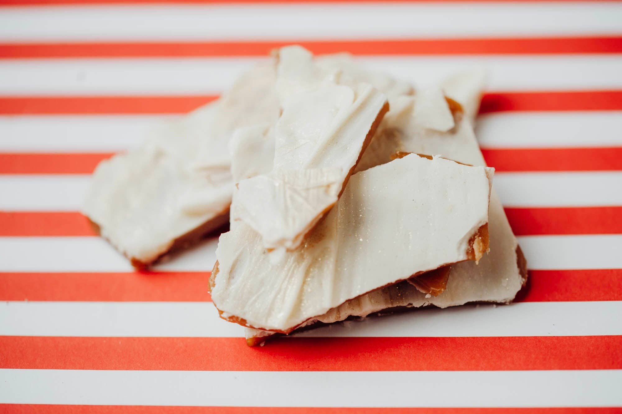 Tasty Good Butter Rum Toffee starts with the base of sweet and delectable butter crunch toffee, and then topped with premium white chocolate and a hint of sweet butter rum flavoring. The toffee is then finished with a edible gold glitter dust - because it's fancy!