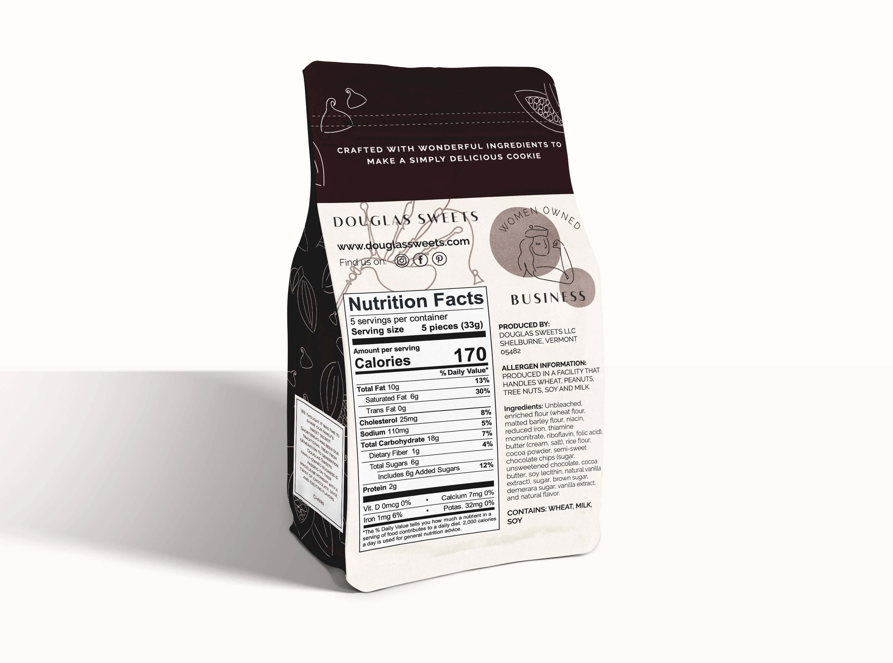 Details - Made in USA, 100% Woman owned - Ships in 1-3 days - Based in Shelburne, VT - UPC: 616312106523 Description A fudgy chocolate, chocolate chip shortbread cookie. The premium quality butter is used to ensure a delicious flavor and our careful baking process offers a light crisp texture. These cookies are packaged in a beautiful resealable bag. Ingredients Unbleached, enriched flour (wheat flour, malted barley flour, niacin, reduced iron, thiamine mononitrate, riboflavin, folic acid), butter (cream, salt), rice flour, cocoa powder, semi-sweet chocolate chips (sugar, unsweetened chocolate, cocoa butter, soy lecithin, natural vanilla extract), sugar, brown sugar, demerara sugar, vanilla extract, and natural flavor. Each bag contains about 24-26 cookies