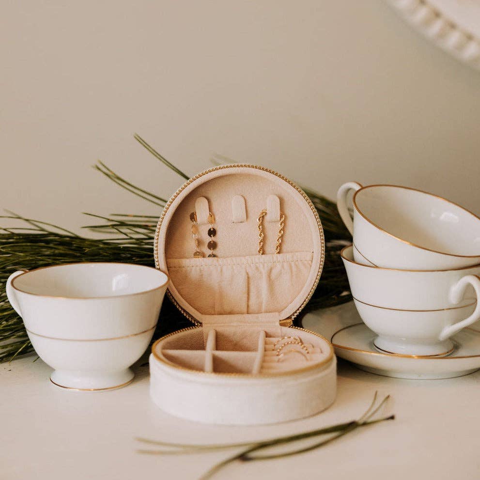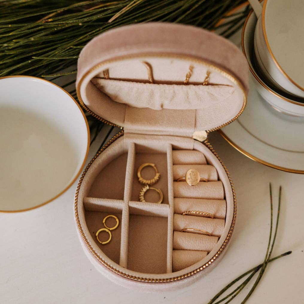 This Jewelry Case is the perfect travel case or at home mini jewelry storage. Features three necklace/bracelets holders to prevent tangling, four earring/ear cuff compartments for organized storage, and six ring slots. The best (and cutest!) way to store your jewelry. Available in velvet white. Mauve Jewelry Co.