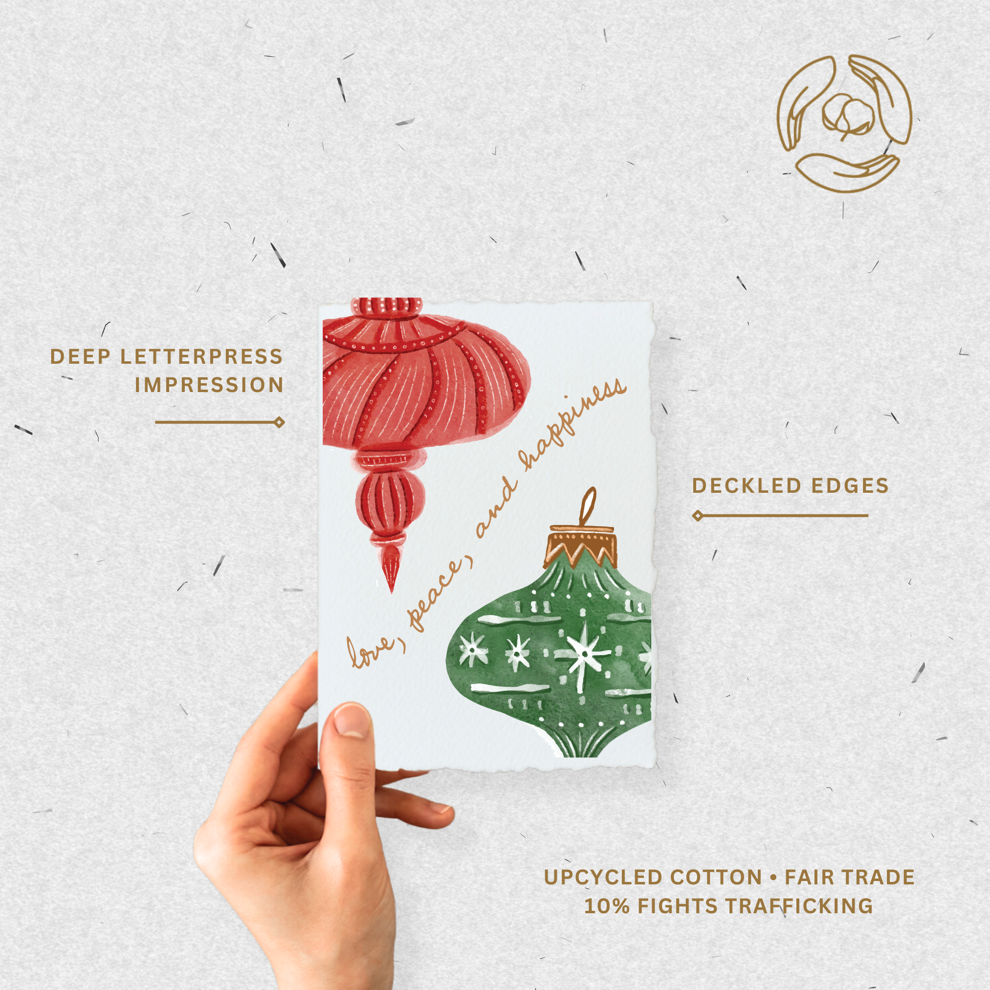 Eco-Friendly. Fair Trade. Gives Back. Handmade letterpress cards made from up-cycled cotton rags intended to be discarded by the garment industry. Inspired by textures, letterpress, sustainability, coffee and people. 10% of our proceeds are donated to fight human trafficking. Perfect for your stores this Christmas! Ornaments on deckled edge paper can be great Christmas Decor!