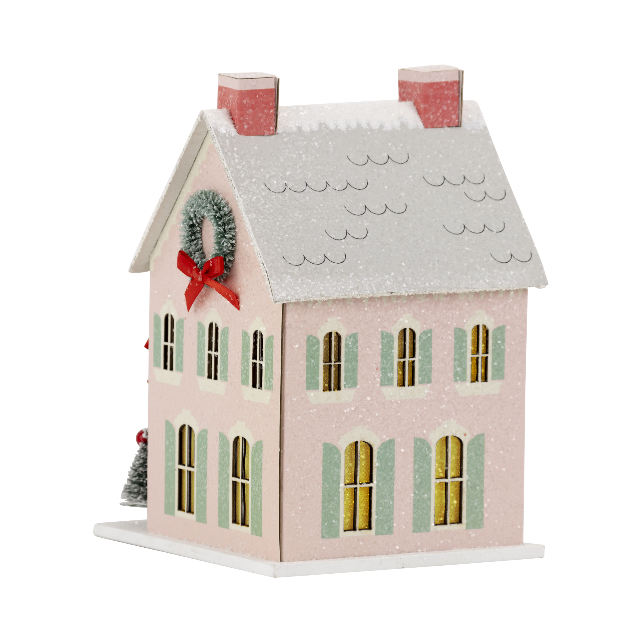 Add some sparkle to your holiday decor with our Christmas Village Merry House. Made of heavyweight paper with glitter accents, this charming village house will bring holiday cheer to any room. Perfect for creating a festive atmosphere and capturing the magic of the season. • House is 4.5" wide x 3.5" deep x 6" tall • Constructed of heavyweight paperboard with glitter accents • includes battery powered light inside (please keep out of reach of small children)