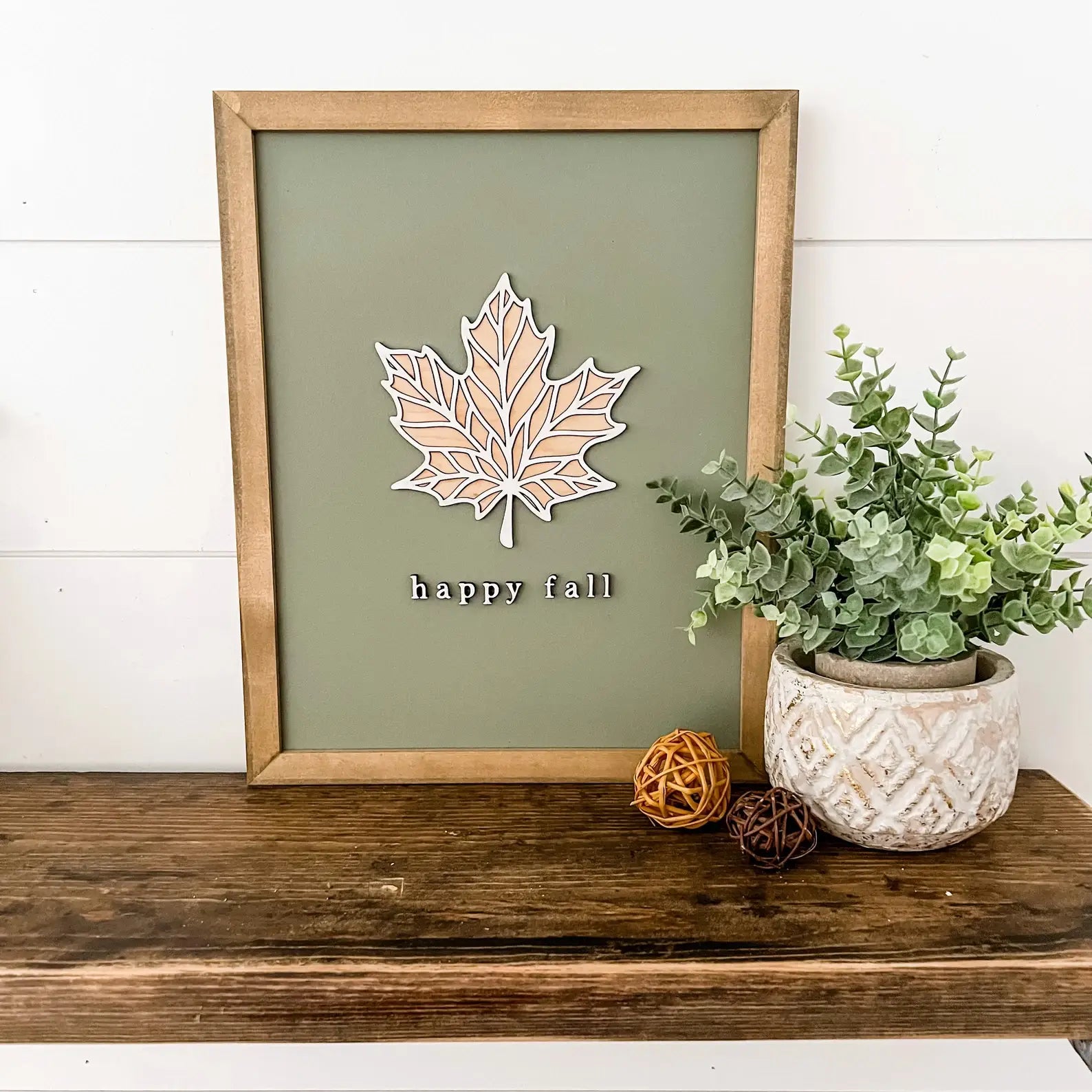 Handmade wooden sign with laser cut leaf and happy fall wording. Each sign has laser cut lettering giving them an added, unique dimension. The background is a painted subtle green color. - Size: approximately 11x14". Add about 1/2" to each side to include frame in measurement. - Comes with hardware to hang your sign.